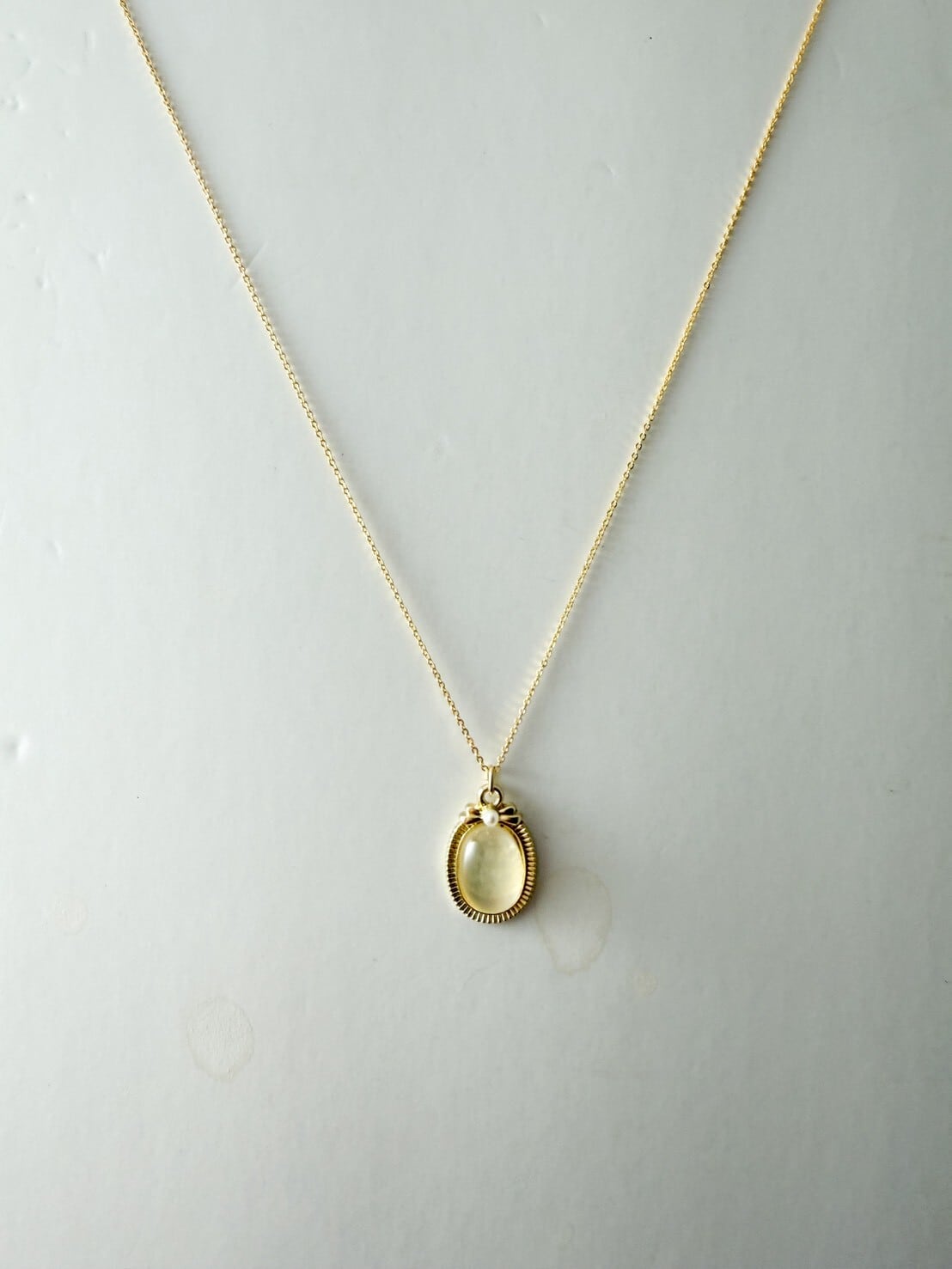 これは石ではないと思います。一見するとムーンストーンのようでもあります。とても優しいペンダントだと思います。